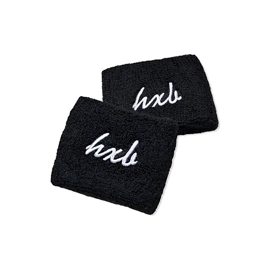 パイル地に”hxb”の筆記体Cursiveロゴが刺繍で施されたリストバンド。